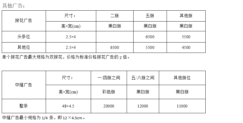 指定非廣告版加收10000元,指定版位加收5000元;三天內加急加收廣告價格的20%。