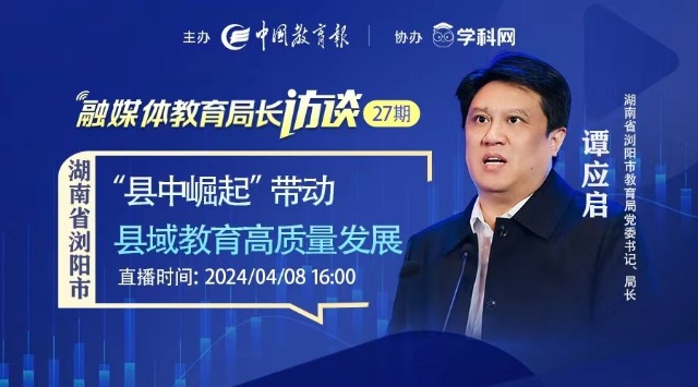 歷經20多年,蹚出了縣中崛起的“瀏陽路徑”,而優質教育也成為了瀏陽的閃亮名片。本期,我們就邀請到了湖南瀏陽市教育局局長譚應啟做客《中國教育報》融媒體教育局長訪談直播間,與大家分享瀏陽市教育高質量發展的探索與實踐!