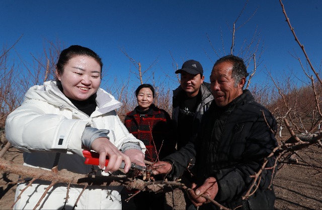 1月4日,甘肅省張掖市臨澤縣職業(yè)中等專業(yè)學(xué)校教師宋鈺(左)指導(dǎo)果農(nóng)修剪果樹。去年,在職教中心老師指導(dǎo)下,科學(xué)管理出效益,村民王東家的近7畝多桃園,收入5.8萬元,比往年多了不少。