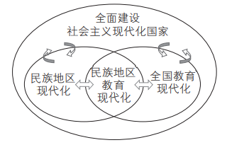 無論全面實現全國教育現代化,還是全面建設民族地區社會主義現代化,都必然包括全面實現民族地區教育現代化。可以說,全面實現民族地區教育現代化是全面實現民族地區現代化、全面實現全國教育現代化、全面建設社會主義現代化國家、全面推進中華民族偉大復興的必要條件。其間關系如下圖所示: