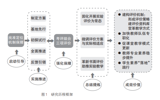 制定研究歷程框架。制定試行方案,選取3所不同層次的學校作為基地校先行。評價方式的優化主要從“過程性評價”“學生操作評價”“書面測試評價”三個維度展開,每個維度間相輔相成共同助推教學方式變革。研究歷程框架如圖1。