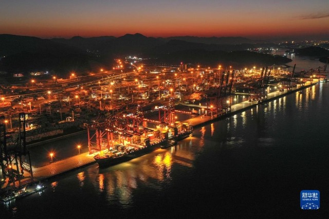 夜幕下,一艘貨輪停靠在寧波舟山港穿山港區集裝箱碼頭(1月31日攝,無人機照片)。新華社記者 黃宗治 攝