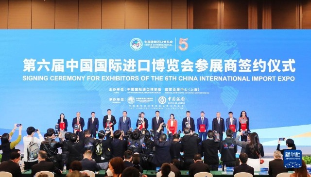 2022年11月6日,2022年中國國際進口博覽會參展商聯盟大會在上海舉行。這是在大會期間進行的第六屆進博會參展商簽約儀式。新華社記者 方喆 攝