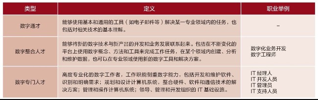 目前,國內外對于“數字人才”(Digital Talent,也稱“數字化人才”)并沒有一致的定義。丹麥政府認為,數字人才需要具備的數字技能,既包含IT工具、編程語言等方面廣泛的技能,也包含非技術技能,如數字商業頭腦和推動數字創新的能力。數字人才可分為三種類型:數字通才(Digital Generalist)、數字整合人才(Digital Integrator)和數字專門人才(Digital Specialist)(見表1)。這三類人才都是丹麥培養的目標,而在人才引留方面則主要關注后兩類人才,因此本文中的“數字人才”也主要指后兩類。