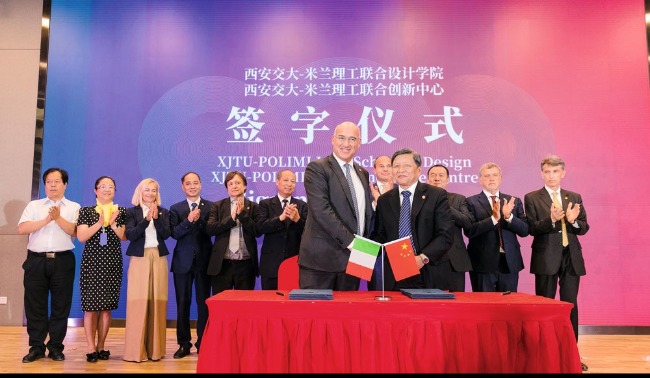 西安交大-米蘭理工聯合設計學院、聯合創新中心揭牌成立,作者(前排右)代表西安交大與米蘭理工大學簽署合作協議