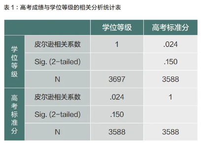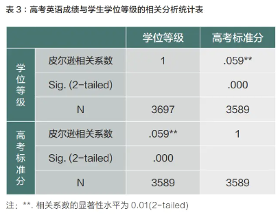 中外合作大學(xué)由于實(shí)行全英文教學(xué),為了防止學(xué)生在學(xué)習(xí)期間難以適應(yīng),各校在招生時(shí)一般都會(huì)對(duì)高考英語(yǔ)的單科成績(jī)有所要求。為了解學(xué)生的高考英語(yǔ)成績(jī)是否會(huì)對(duì)其最終所取得的學(xué)位等級(jí)有影響,本研究用皮爾遜相關(guān)系數(shù)法檢測(cè)了這兩個(gè)變量之間的關(guān)系(見(jiàn)表3),得到P值小于0.05,兩個(gè)變量之間有顯著的正相關(guān)關(guān)系。這一研究結(jié)果與相關(guān)領(lǐng)域已有的研究結(jié)論相吻合,如國(guó)際數(shù)學(xué)與科學(xué)學(xué)習(xí)趨勢(shì)研究(TIMSS)2015年的大數(shù)據(jù)調(diào)查顯示,學(xué)生的家庭語(yǔ)言與教學(xué)考試語(yǔ)言的一致性是學(xué)生學(xué)業(yè)成績(jī)的重要影響因素之一[1]。本研究中所有學(xué)生皆為中國(guó)學(xué)生,其家庭語(yǔ)言與英語(yǔ)有很大差異,因此學(xué)生英語(yǔ)能力的高低必然會(huì)對(duì)學(xué)業(yè)成績(jī)產(chǎn)生影響,而上述研究結(jié)論也印證了這一假設(shè)。