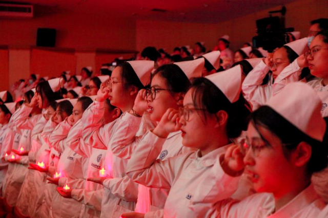 今年護士節的主題是“發展護士隊伍,改善護理服務”。作為高水平應用型護理人才的培養主陣地,上海健康醫學院不斷深化教育教學改革,構建了“產學研賽扶創”“六位一體”的人才培養模式,培育會溝通、會評估、會計劃、會實施、會宣教、會反思的“六會”護理人才,將職業精神、人文情懷融入人才培養全過程。儀式現場,護理與健康管理學院教師徐淑芹帶領護生們進行莊嚴宣誓,鏗鏘有力的誓言激勵著在場的每一位學生,更加堅定了“積極投身護理事業,為人民健康保駕護航”的決心。