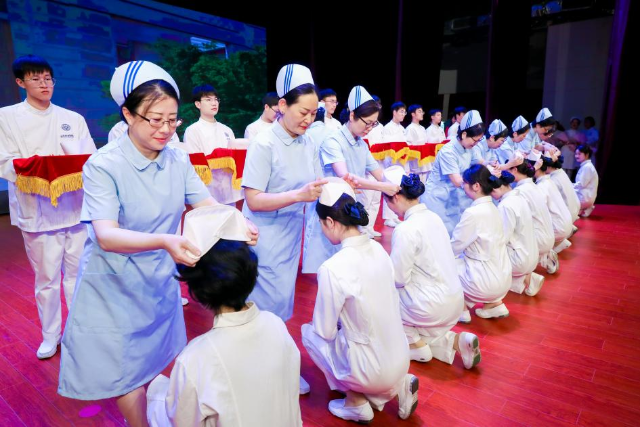 護理行業專家們共同為即將走上實習崗位的學生授帽。學校供圖