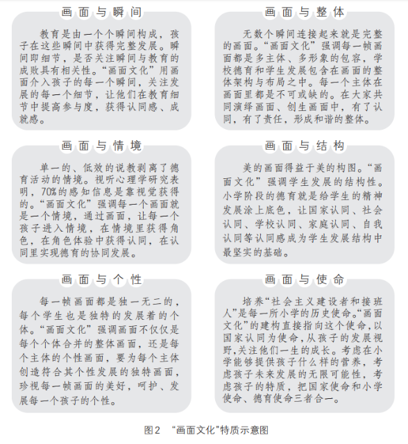 二是提煉出“畫面文化”及其育人特質(zhì),完成文化對(duì)德育體系的整體浸潤。利用直觀、形象的畫面進(jìn)行德育,更符合小學(xué)生心理特征與認(rèn)知規(guī)律,更容易讓德育入情入境入腦入心。為此,學(xué)校從影視資源等育人元素中提煉出“畫面文化”,用文化增強(qiáng)育人的包容性,將德育工作植入學(xué)校發(fā)展核心,使德育工作融入學(xué)校工作的方方面面,增強(qiáng)德育的整體性(見圖2)。