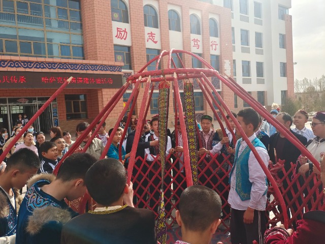 甘肅省阿克塞哈薩克族自治縣中學學生體驗氈房搭建。向國忠 供圖
