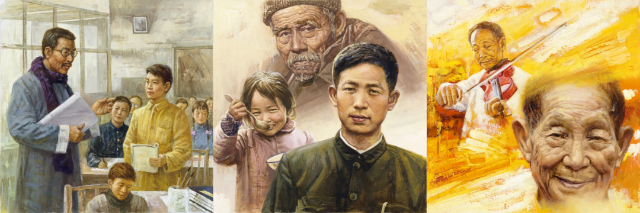 左起:袁隆平少年形象、袁隆平青年形象、袁隆平老年形象。人民美術出版社供圖