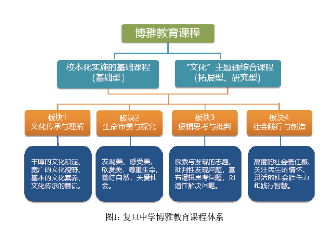 學校在傳承百年教育思想的基礎上,立足“從歷史名校到現代名校”的發展愿景,提出了“文化立校,自強育人”的辦學思想和“博學而篤志,切問而近思”的育人目標,堅持“傳統與現代、傳承與發展、改革與創新”的發展理念和“固本活化”的發展策略,大膽探索實踐博雅教育,以“高中多樣化特色發展”“高中學生創新素養培育”等部市合作項目的研究為抓手和載體,開展以“課程·課堂·踐行”為主線的教育教學改革。經過十余年教育教學改革和實踐,復旦中學建構起以“文化”主題軸綜合課程為核心的博雅教育課程體系,以培育學生高階思維為核心的“留白式”課堂教學體系,以“學子講堂”為核心的學子踐行體系,彰顯“文理相融、人文見長”的人文特色。