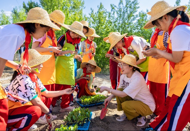 2023年5月18日,內(nèi)蒙古呼和浩特市玉泉區(qū)百什戶小學(xué)的老師在校園“開(kāi)心農(nóng)場(chǎng)”向?qū)W生講解栽種茄子秧苗的要領(lǐng)。通訊員 丁根厚 攝