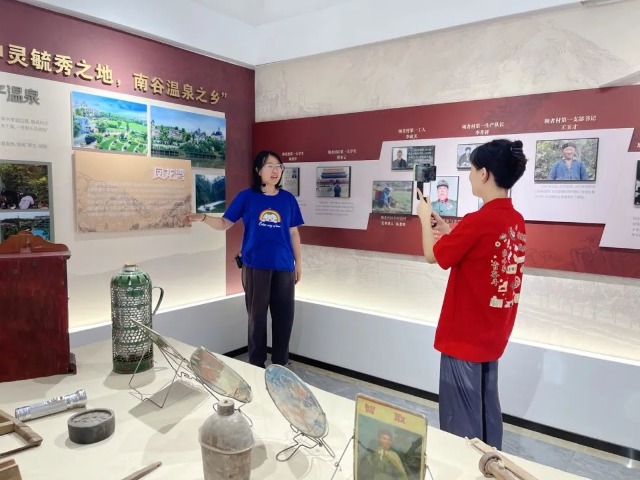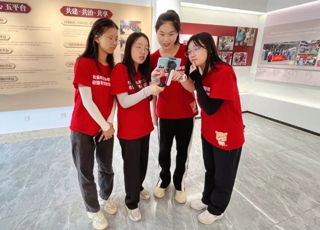 學(xué)生們?cè)谠颇蠈さ樘磷咏值缐握叽遴l(xiāng)村振興記錄展的實(shí)踐中拍攝Vlog視頻 學(xué)校供圖