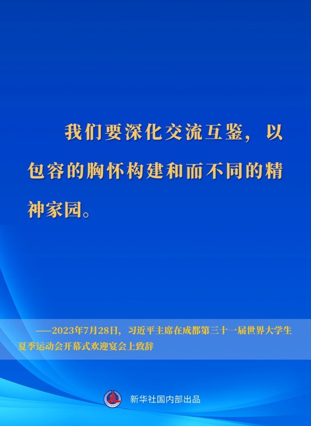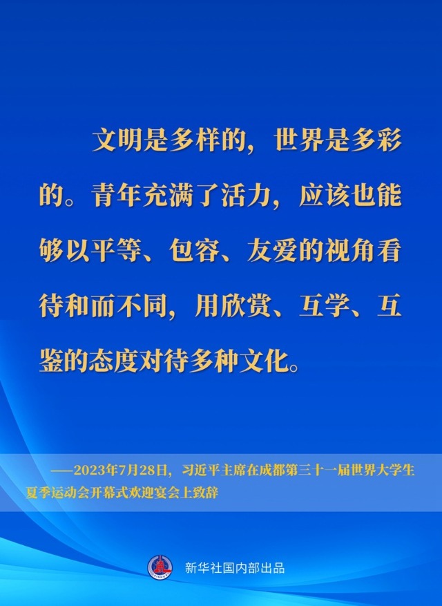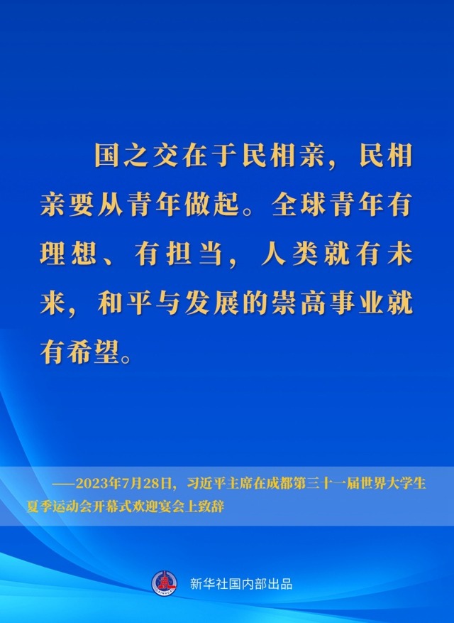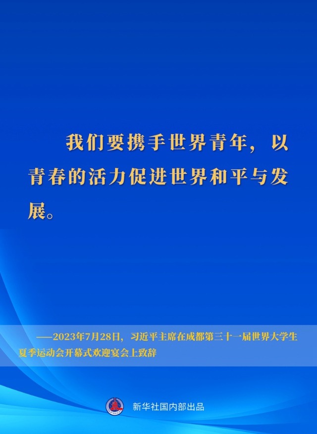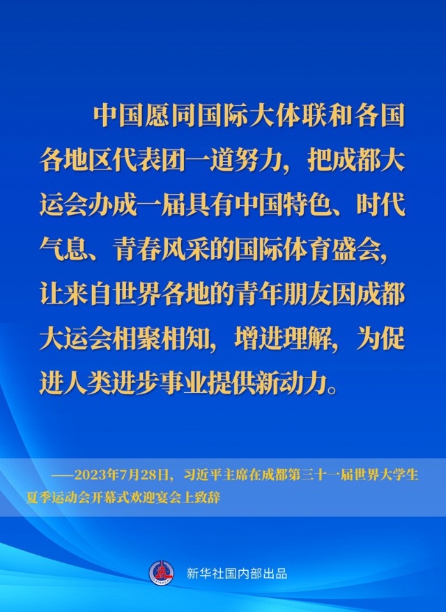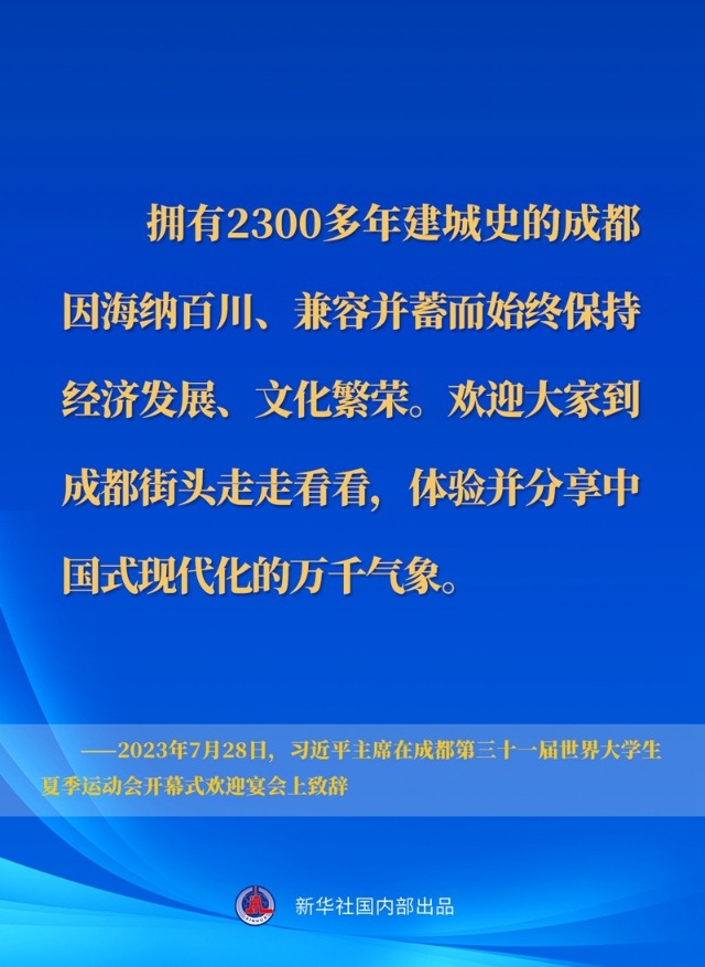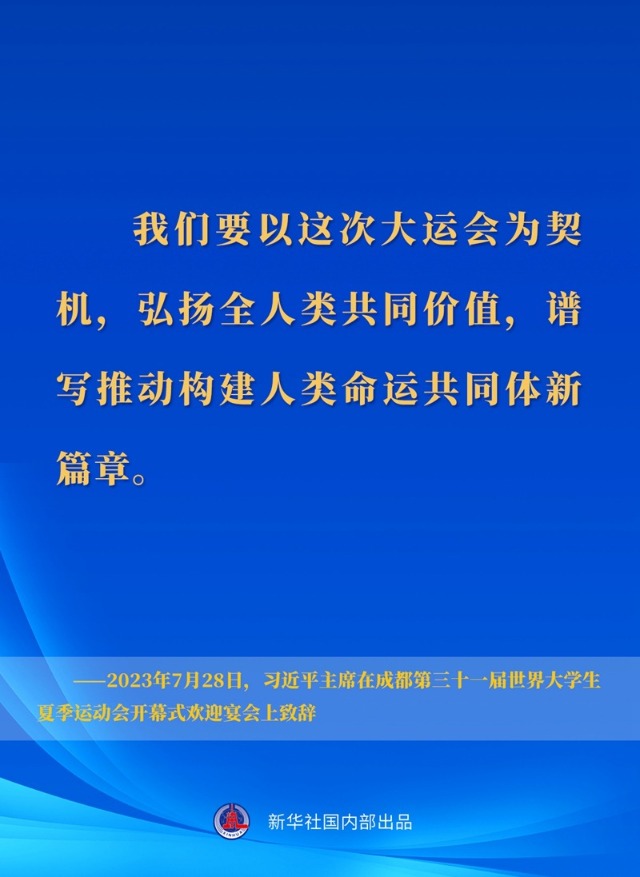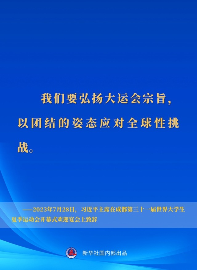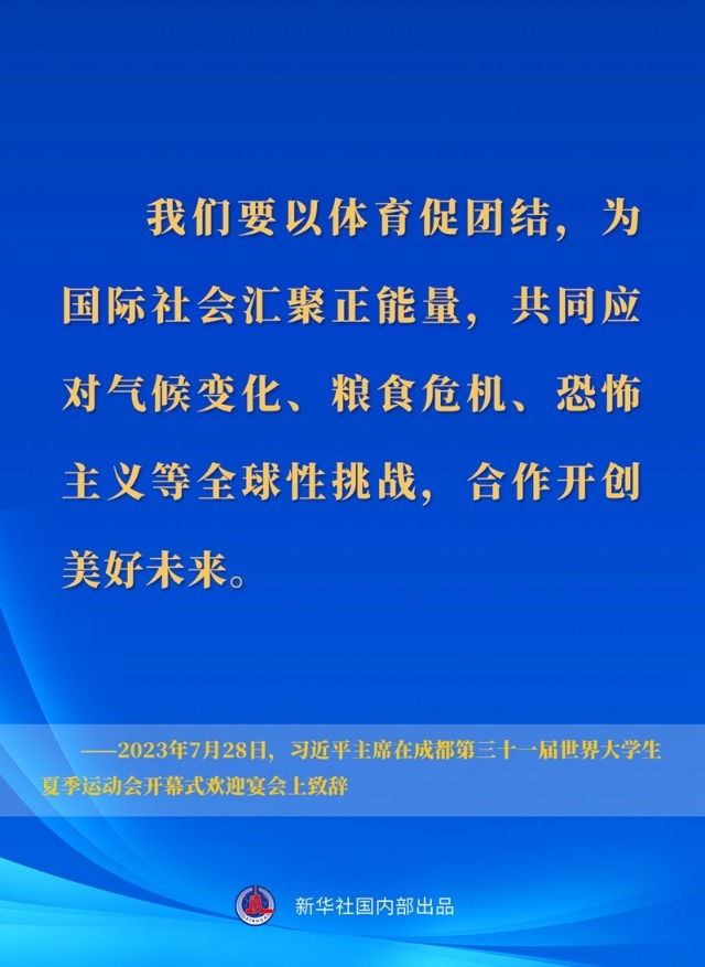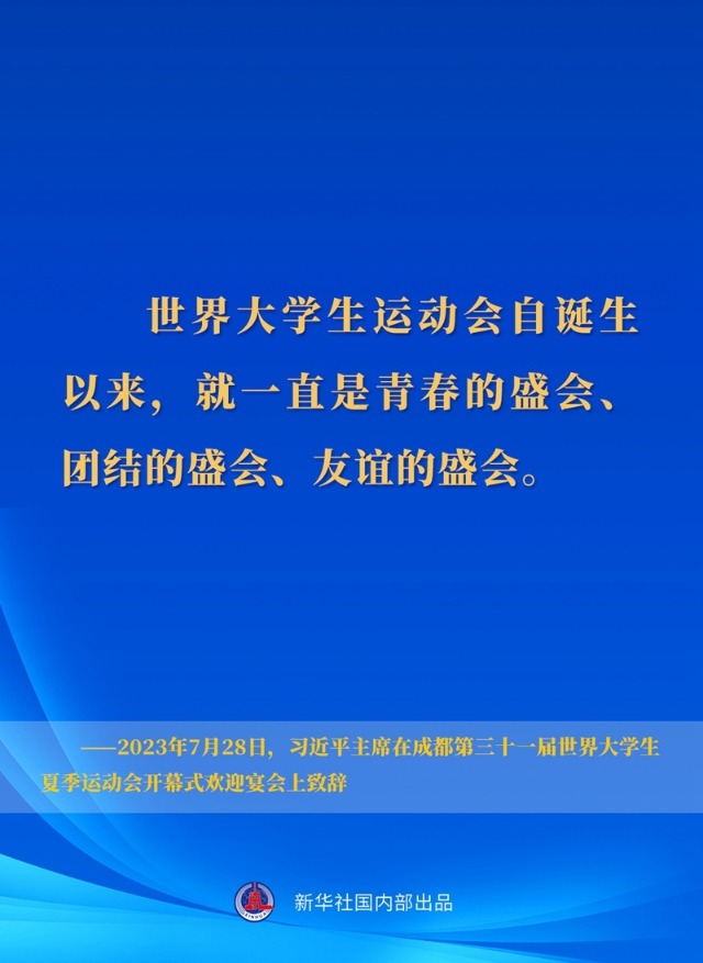 7月28日中午,國家主席習近平和夫人彭麗媛在四川省成都市金牛賓館舉行宴會,歡迎出席成都第三十一屆世界大學生夏季運動會開幕式的國際貴賓。一起來看習近平主席在歡迎宴會上的致辭要點。