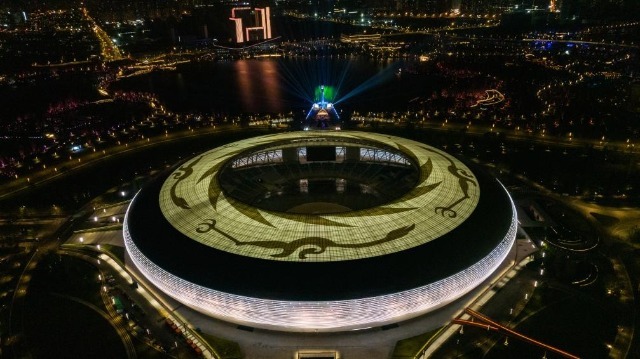 這是4月19日拍攝的第31屆世界大學生夏季運動會開幕式主體育場及主火炬(無人機照片)