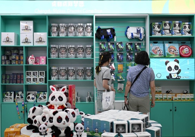 7月18日,市民在成都大運會成都博物館官方特許商品零售店內選購“蓉寶”公仔。