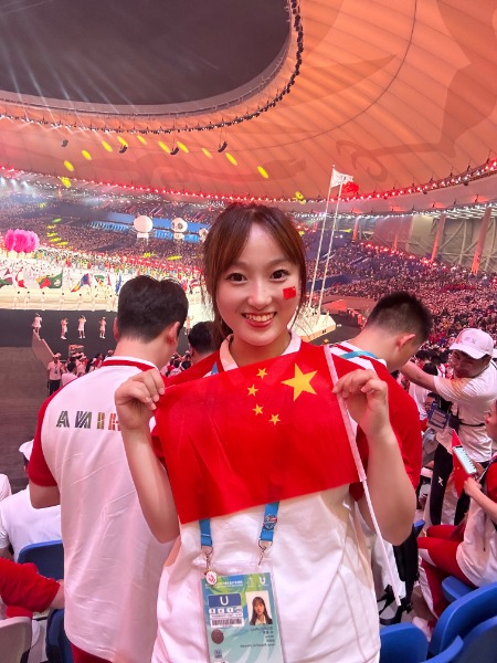 宋翠芳在參加大運會開幕式。河南理工大學供圖