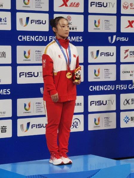 在本次成都大運會女子南刀決賽中,宋翠芳原本是第六個出場。但是由于前一位菲律賓選手比賽中不慎受傷,正在熱身的宋翠芳提前上場。她沒有受到這種意外的任何影響,以良好的心態、自如的表演,躍居榜首,最終以出色的表現奪得冠軍,為中國代表團奪得第二枚金牌。