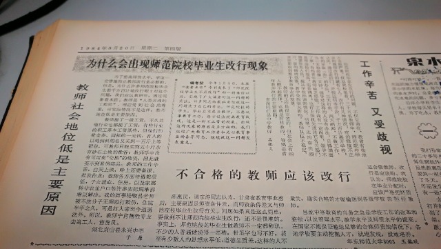 那一年正好有畢業實習,實習過程中耳聞目睹的一些事,讓我不由得對師范畢業生是否都適合當老師陷入了沉思。的確,多數同學在實習過程中展示了自己的實力,得到了實習學校師生和學生家長的認可。我和另一位年長的余同學一起在華東師大二附中實習語文教學,采用了啟發式教學的方式,多數同學和家長都算認可,也有一些家長敏銳感受到了孩子學習和作業情況的變化找到學校了解情況。但我也聽到不少在其他學校實習發生的事情,諸如學校管理混亂、學生厭學、家長對學生情況不聞不問、學校管理層和個別教師敷衍塞責等,一些在這類學校實習的同學難以正常開展教學。我們在一些學校發現,個別學校一到下午整個教學活動都會停擺,學生沒人管,實習老師沒事干;還了解到個別實習老師不具備基本的教學能力,有的嚴重口吃,有的寫不好一個教案,一堂課上20分鐘就卡殼了,師生都很尷尬。還有一些實習的學生課上敷衍了事,課下到處活動,為畢業分配找關系,在實習學校和同學中間影響很不好。針對這些現象,我有感而發,連夜寫了一稿,反映了這些實際問題,并提出一些人雖然學的是師范,但難以在未來勝任教師職責,并不適合當老師。《中國教育報》很快以《不合格的教師應該改行》為題,發表了我的這篇來稿。