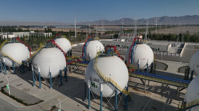 這是2023年6月30日拍攝的中國石化新疆庫車綠氫示范項目制氫廠儲氫罐區(qū)(無人機(jī)照片)。新華社記者 顧煜 攝
