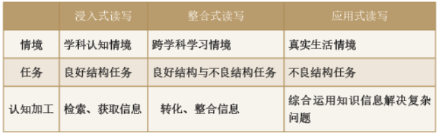 不同情境下的三類讀寫并非截然分開,而是呈現(xiàn)進(jìn)階升級(jí)又互相聯(lián)通的關(guān)系。學(xué)習(xí)情境從學(xué)科認(rèn)知情境到跨學(xué)科學(xué)習(xí)情境到真實(shí)生活情境,問(wèn)題任務(wù)從良好結(jié)構(gòu)到不良結(jié)構(gòu),認(rèn)知加工從獲取信息的淺加工到整合運(yùn)用知識(shí)解決真實(shí)和復(fù)雜問(wèn)題的深度加工,最終實(shí)現(xiàn)由做題到做事到做人,由知識(shí)到素養(yǎng),由單一學(xué)科素養(yǎng)到融合發(fā)展素養(yǎng)的讀寫模式轉(zhuǎn)型。