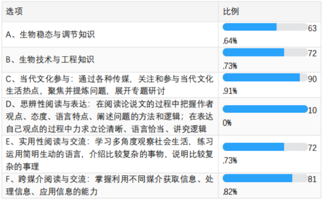 應(yīng)用式讀寫重在“通過(guò)讀寫學(xué)習(xí)”解決真實(shí)問(wèn)題,同時(shí)在遷移應(yīng)用中“學(xué)習(xí)讀寫”,做到兩者的兼顧與平衡。北京市亦莊實(shí)驗(yàn)中學(xué)和北京四中作為項(xiàng)目實(shí)驗(yàn)學(xué)校,均在疫情期間開發(fā)了應(yīng)用式讀寫課程,以項(xiàng)目化學(xué)習(xí)的方式進(jìn)行教學(xué)實(shí)踐,成效顯著。亦莊實(shí)驗(yàn)中學(xué)以“作為國(guó)家民間智庫(kù)的研究員,全面研究2020年疫情并形成《國(guó)家突發(fā)公共衛(wèi)生事件應(yīng)急預(yù)案》”為核心任務(wù),開展跨學(xué)科項(xiàng)目化學(xué)習(xí),所有模塊的學(xué)習(xí)都以讀寫作為學(xué)習(xí)手段。如模塊一“認(rèn)識(shí)新冠疫情的真面目”,其任務(wù)是提交一篇科普短文并錄制中英雙語(yǔ)的宣傳視頻,完成一次科學(xué)普及活動(dòng)。該項(xiàng)目化學(xué)習(xí)的最終成果是以小組為單位形成《國(guó)家突發(fā)公共衛(wèi)生事件應(yīng)急預(yù)案》,“預(yù)案”需要運(yùn)用前幾個(gè)模塊的結(jié)論與圖表,并插入組織結(jié)構(gòu)圖與流程圖。此課程的學(xué)科融合度、項(xiàng)目化程度高,以讀寫作為學(xué)習(xí)方式和思維方式完成真實(shí)任務(wù)、解決真實(shí)問(wèn)題,促進(jìn)了學(xué)生科學(xué)素養(yǎng)與人文素養(yǎng)的綜合提升。北京四中則開展以“病毒和疫苗”為主題的項(xiàng)目式學(xué)習(xí),項(xiàng)目組的語(yǔ)文和生物教師,希望“能和同學(xué)們一起從我們的課桌、我們的作業(yè)、我們的考綱中抬起頭來(lái),重新學(xué)習(xí)點(diǎn)什么,思考點(diǎn)什么,并將所學(xué)所思投入這場(chǎng)尚未結(jié)束的災(zāi)難”。課程結(jié)束后,課題組組織了問(wèn)卷調(diào)研,其中一道題的調(diào)研數(shù)據(jù)如表2。