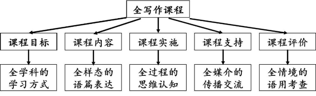同時(shí),構(gòu)建了“全寫作”課程模型。該模型以“全學(xué)科”的課程目標(biāo)定位為基點(diǎn),形成“目標(biāo)—內(nèi)容—實(shí)施—支持—評(píng)價(jià)”的邏輯鏈條。其核心要義是讓寫作與真實(shí)生活關(guān)聯(lián),以真實(shí)情境中的寫作促使真實(shí)學(xué)習(xí)的發(fā)生,促進(jìn)人的全面發(fā)展(見圖1)。