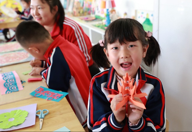 9月15日,敦煌市幼兒園,一名小朋友展示自己的剪紙作品。