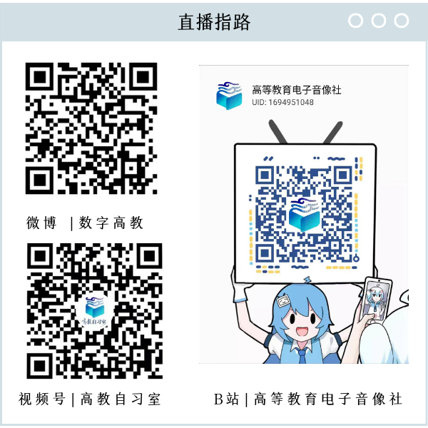 本次活動將通過數字高教微博、高教自習室視頻號、B站高等教育電子音像社官方賬號進行全網直播,直播時間為19:30—21:00,掃碼即可觀看。