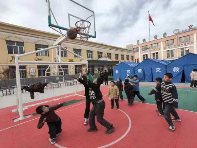 高李保安族春蕾小學安置點的操場上,幾個男學生在打籃球,幾個女學生跳著繩。