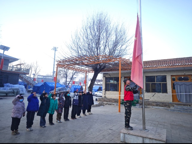 “全體都有,稍息,立正……出發。”12月22日,震后第4天,清晨7點40,甘肅省積石山縣劉集鄉高李村一社安置點幾排帳篷中間的空地傳來中氣十足的整隊口號,10多名學生排著整齊的隊伍,跟著“教官”齊步前進。今天,他們要在安置點前的小廣場舉行升國旗儀式,隨后開啟他們的災后“第一課”,這一刻起,高李村一社臨時“帳篷學校”成立了。