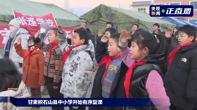 12月25日,甘肅省積石山縣中小學有序復課,積石山縣152個帳篷小學全部開課。1136名教師下沉安置點開展教學活動。早上8:30,在大河家鎮集中安置點的帳篷小學前面,41名學生和10名老師共同舉行了簡單而隆重的升旗儀式。其他的帳篷學校也會根據各自情況,舉行升旗儀式。