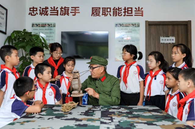 近日,浙江省湖州市長興縣呂山小學在呂山村老兵驛站聆聽退役老兵講紅色故事。周洪峰 攝