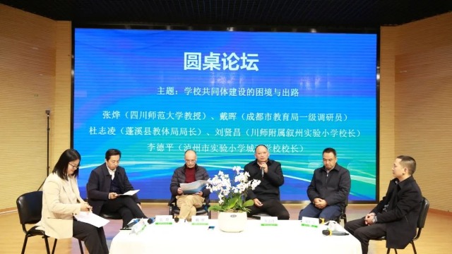 在圓桌論壇環(huán)節(jié),四川師范大學教授張燁、成都市教育局一級調研員戴暉、蓬溪縣教體局局長杜志凌、四川師范大學附屬敘州實驗小學校長劉賢昌、瀘州市實驗小學城西學校校長李德平與主持人、《四川教育》編輯彭之梅就“學校共同體建設的困境與出路”這一話題展開了討論。