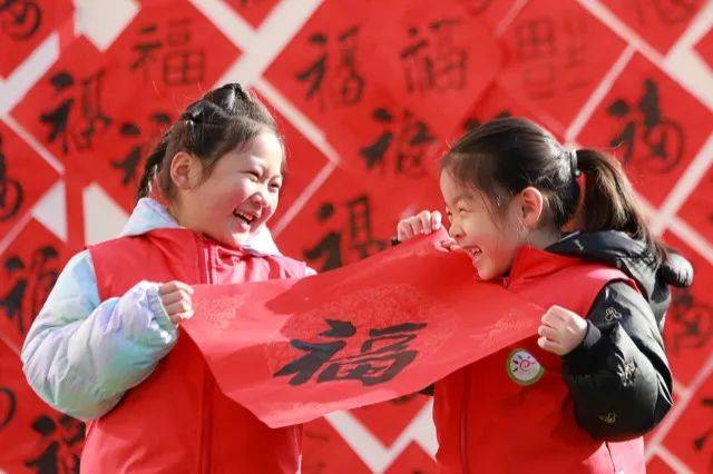 小朋友展示書法志愿者贈(zèng)送的福字 李海濤 攝