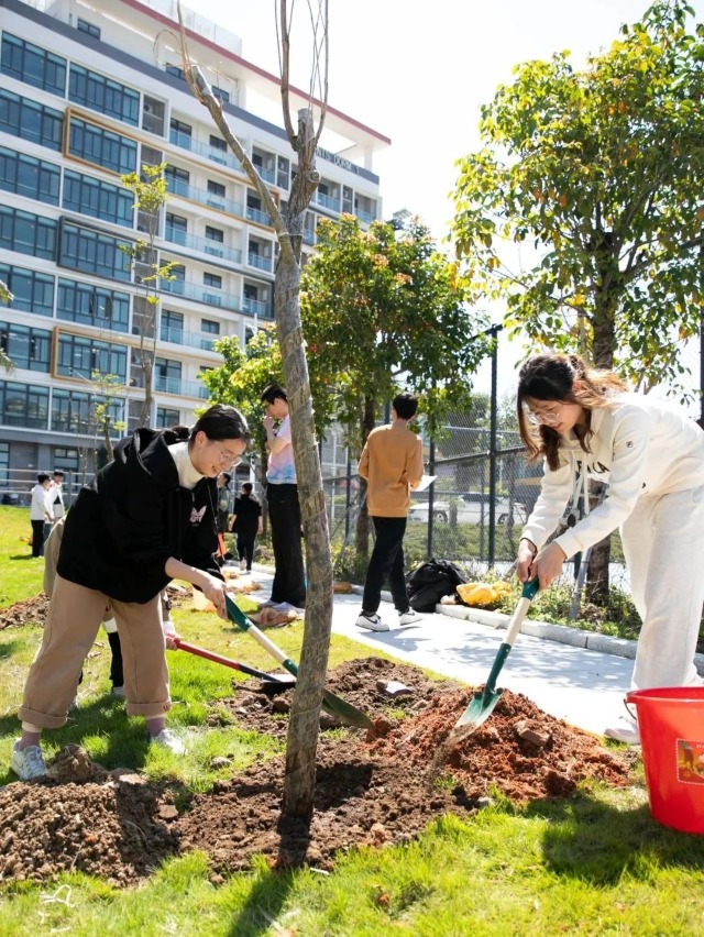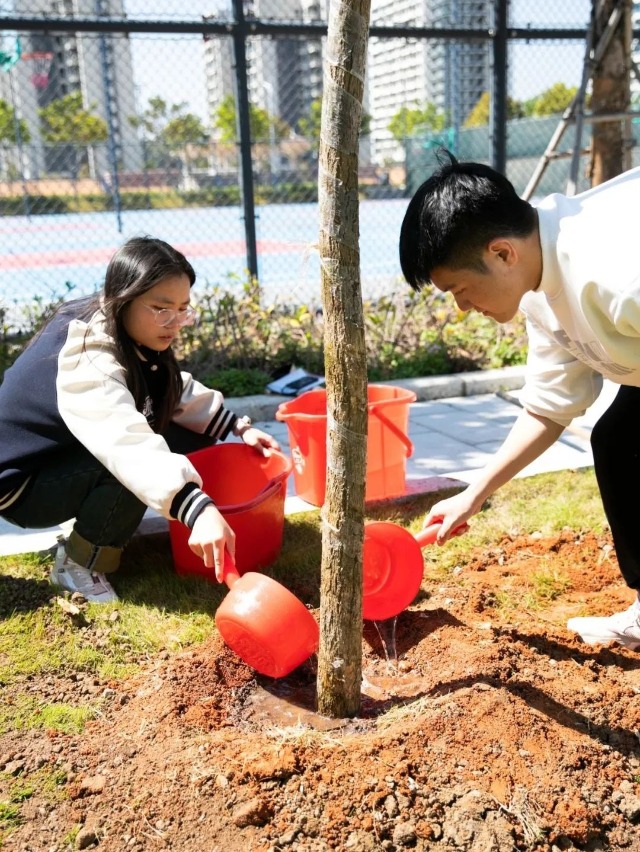 活動現(xiàn)場,參加植樹的同學們合力扶樹正苗、填土圍堰、培土踩實、提水澆灌,各個環(huán)節(jié)銜接有序。大家熱情高漲、配合默契,共同在廣以校園內(nèi),繪制出一幅早春風景圖。