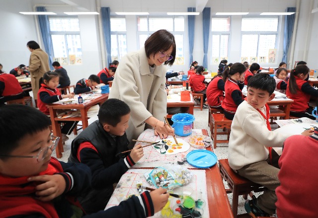 3月26日,課后延時服務時間,徐州市大學路實驗學校郜茜老師帶領(lǐng)學生利用國畫裝飾扇面。