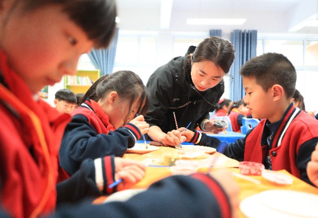 3月26日,課后延時服務時間,徐州市大學路實驗學校陶藝社團的糖果老師指導學生完成陶藝作品。