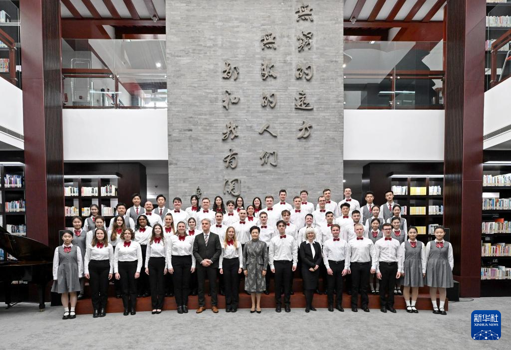 3月28日下午,國家主席習近平夫人彭麗媛在北京市第三十五中學會見來華參訪的德國伯樂中文合唱團師生代表。這是彭麗媛來到學校書院,受到師生們熱情歡迎。新華社記者謝環馳攝