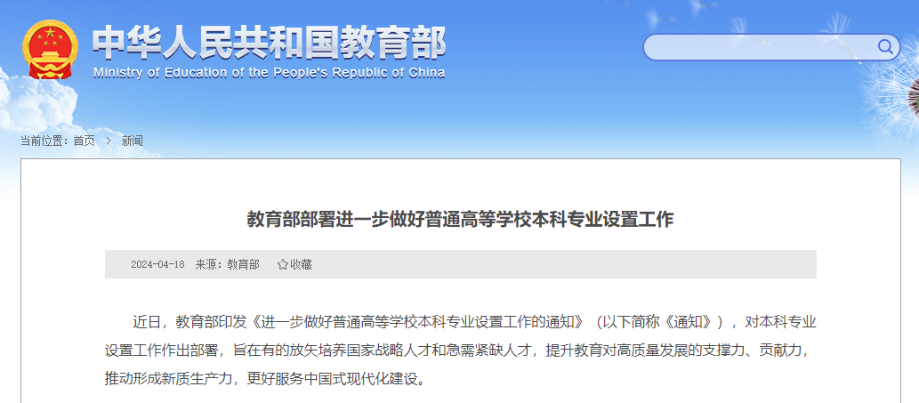 近日,教育部印發《進一步做好普通高等學校本科專業設置工作的通知》(以下簡稱《通知》),對本科專業設置工作作出部署,旨在有的放矢培養國家戰略人才和急需緊缺人才,提升教育對高質量發展的支撐力、貢獻力,推動形成新質生產力,更好服務中國式現代化建設。