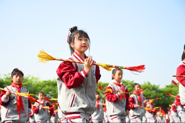 近日,在江蘇省徐州市睢寧縣李集中心小學(xué),近1000名小學(xué)生在操場上進(jìn)行”錢桿舞”文藝表演。洪星 攝
