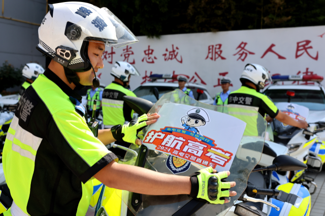6月6日,山東省棗莊市公安局市中分局交通警察大隊(duì)鐵騎隊(duì)員在摩托車上粘貼“護(hù)航高考”標(biāo)志。通訊員 吉喆 孟見(jiàn) 攝