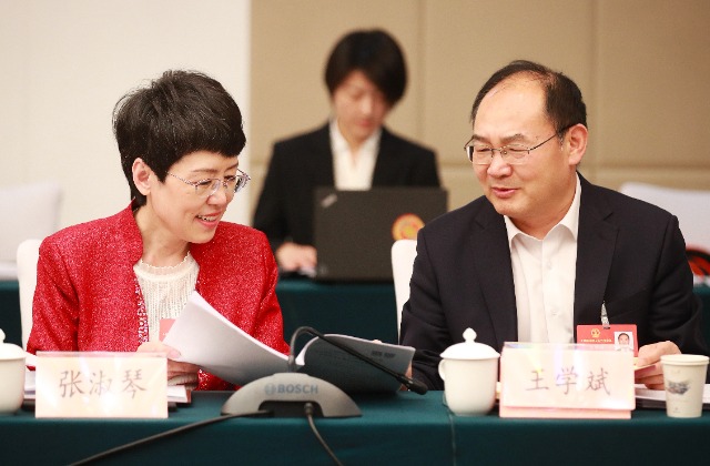 3月10日,十四屆全國人大三次會議山東代表團小組會議,全國人大代表、臨沂市北城小學黨總支書記張淑琴(左)與全國人大代表、臨沂大學食品研究院院長王學斌交流。