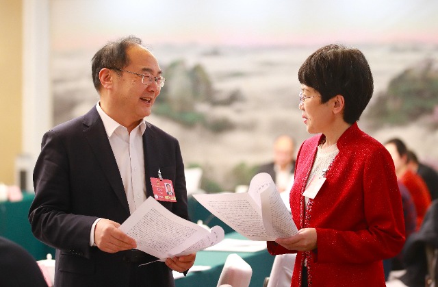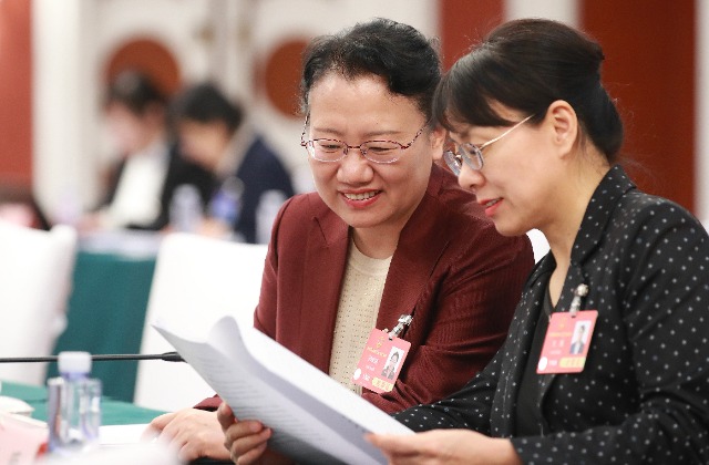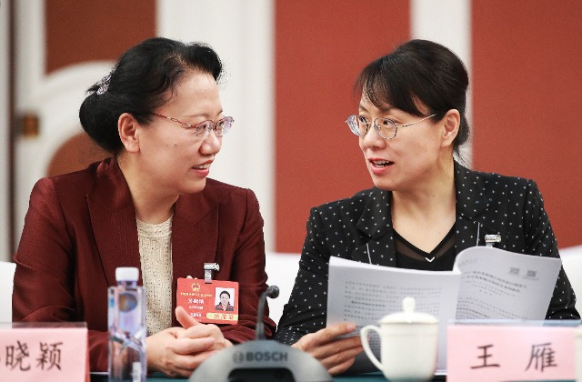 3月10日,十四屆全國人大三次會議山東代表團小組會議,全國人大代表、棗莊市第三中學教師孫曉穎(左)與全國人大代表、煙臺市樹德技工學校副校長王雁交流討論。