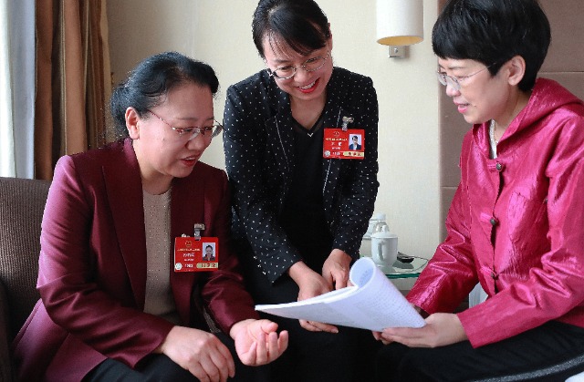 3月10日,十四屆全國人大三次會議山東代表團小組會議結束后,孫曉穎(左)、王雁(中)和張淑琴3位全國人大代表聚在一起交流討論。