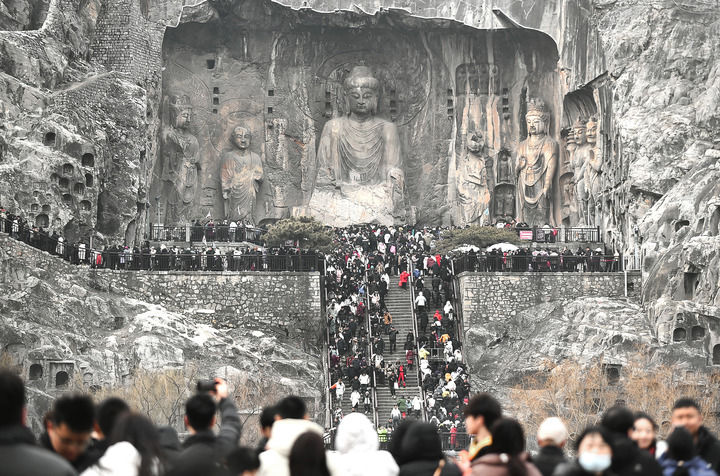 2025年1月31日,游客在河南洛陽(yáng)龍門石窟景區(qū)參觀游覽。新華社發(fā)(黃政偉 攝)