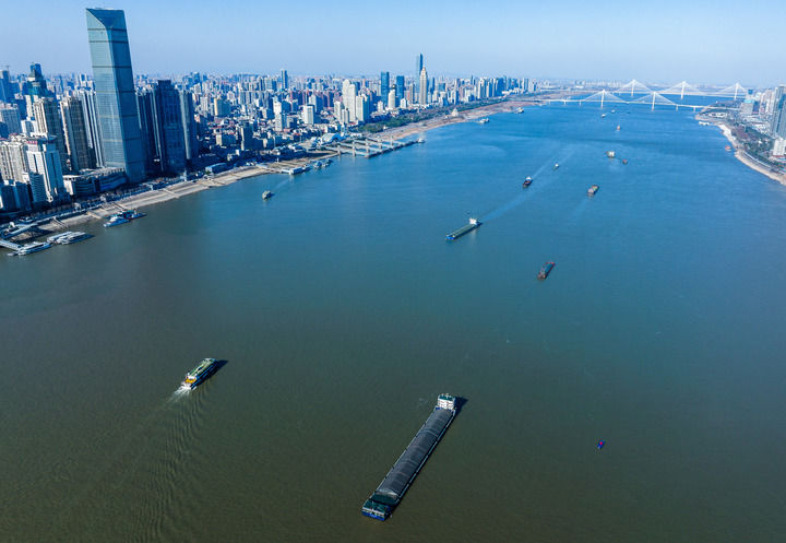 這是2024年1月23日拍攝的長(zhǎng)江武漢江段水域(無(wú)人機(jī)照片)。新華社記者 肖藝九 攝