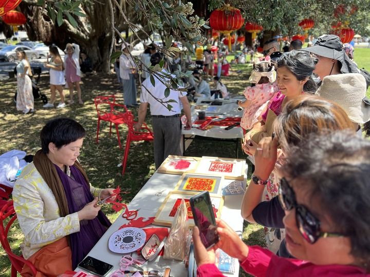 2024年2月4日,湖北鄂州雕花剪紙省級(jí)代表性傳承人曹小琴在新西蘭向當(dāng)?shù)孛癖娬故炯艏埣妓嚒P氯A社發(fā)