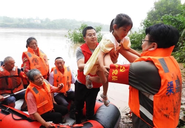 2024年7月12日,在四川省達州市渠縣李渡鎮燈臺社區,黨員干部志愿者在洪水中轉移被困村民。新華社發(鄧良奎 攝)